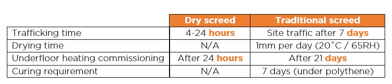 Time is often of the essence and dry screed floor panels are the solution. Whether building on site or in an off-site factory the boards are quick and easy to install. The interlocking panels and the installation system require just 24 hours before being fully trafficable. This allows floor finishes to be installed much sooner than with traditional screed.