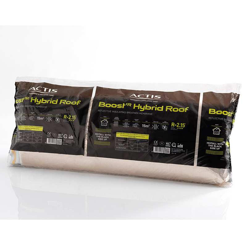 Actis BOOST'R HYBRID ROOF is a multifoil insulation product with a built in breather membrane function and an exceptional thermal performance. This allows for a reduction in the number of installation steps whilst reducing the thickness of the main insulation to achieve the same required U-Value. It can be used in conjunction with any type of insulation.