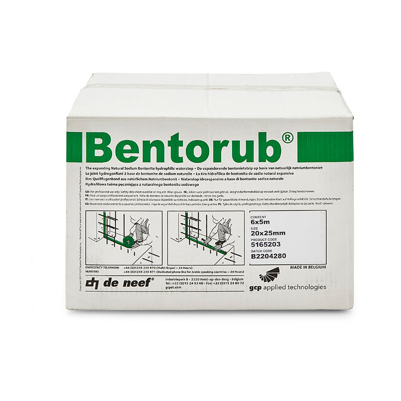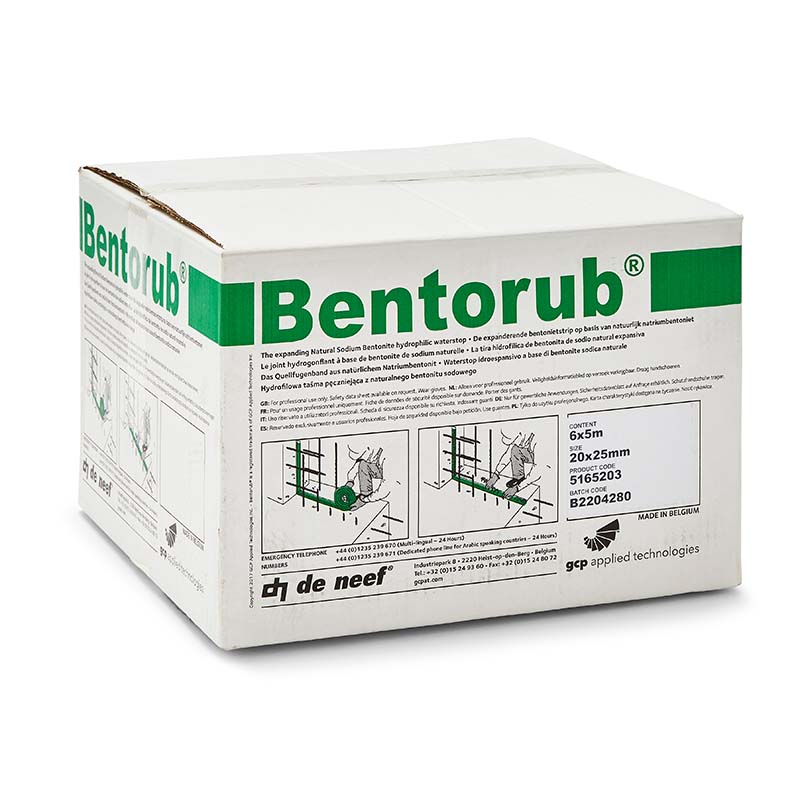 Bentorub®+ is a green flexible hydrophilic strip of approx. 25 by 20 mm, made of natural sodium bentonite clay and synthetic rubber. Bentorub®+ is manufactured in lengths of approx. 5 metres. The swelling properties are created by the particle structure of the clay. In contact with water and in confined conditions, Bentorub®+ will swell to approximately 4V and create a waterproofing pressure inside the joint. The expansive clay mass will thus seal these hair line cracks and voids in the joint. The first expansion is delayed to prevent the strip from reacting too soon with possible rainwater, before or during the installation