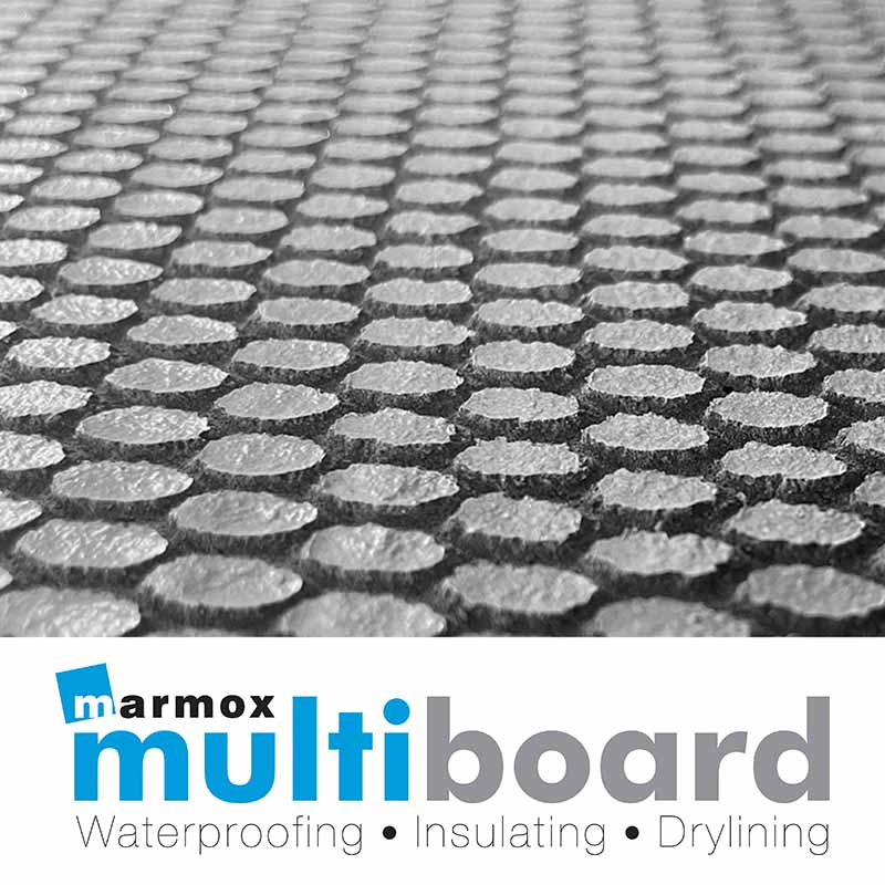 Marmox Multiboard is a BBA certified multi-application board that merges water resistance, thermal insulation and structural strength in one product. Multiboards are made of extruded polystyrene foam (XPS) which is reinforced with a fibreglass mesh and then embedded in a cement polymer mortar, covering both sides. The boards are lightweight and easy to cut with minimal dust, and can be tiled, plastered or rendered, both indoors and outdoors.