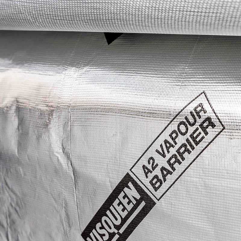 Visqueen A2 Vapour Barrier is a multi-layer reinforced aluminium AVCL (air and vapour control layer). The product has a reflective aluminium finish on the upper surface and a matt aluminium surface on the reverse. The barrier is supplied in single wound rolls (not folded).