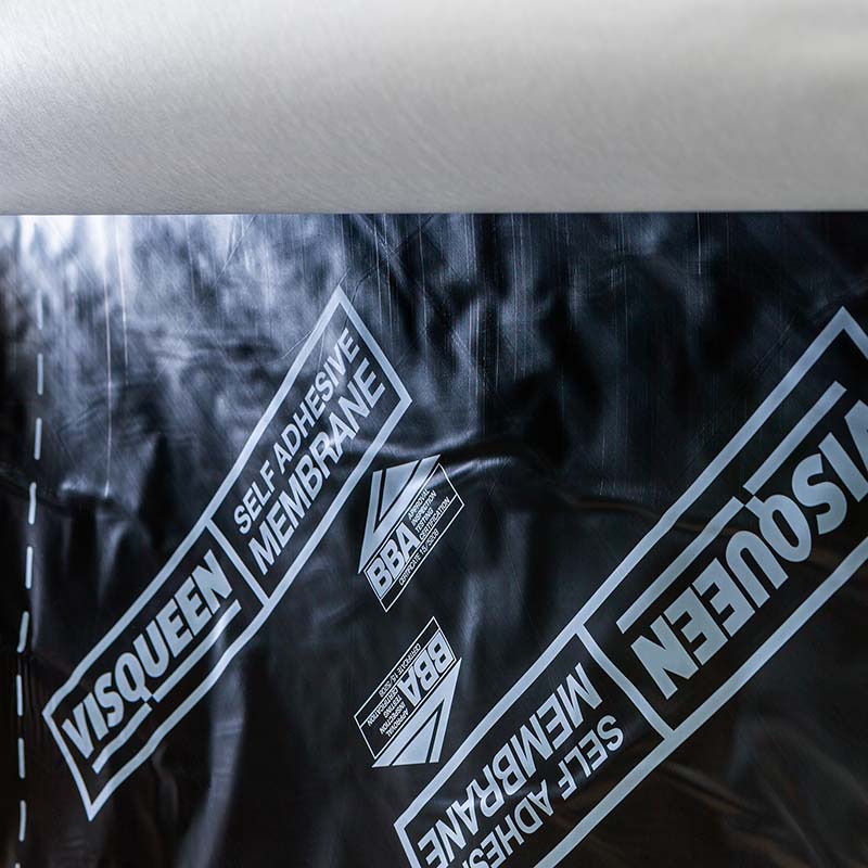 Visqueen Self Adhesive Membrane is a modified bitumen rubber membrane with a self adhesive coating protected by a removable polyethylene release film. It is dark grey on the upper surface and supplied in rolls 1m x 20m.