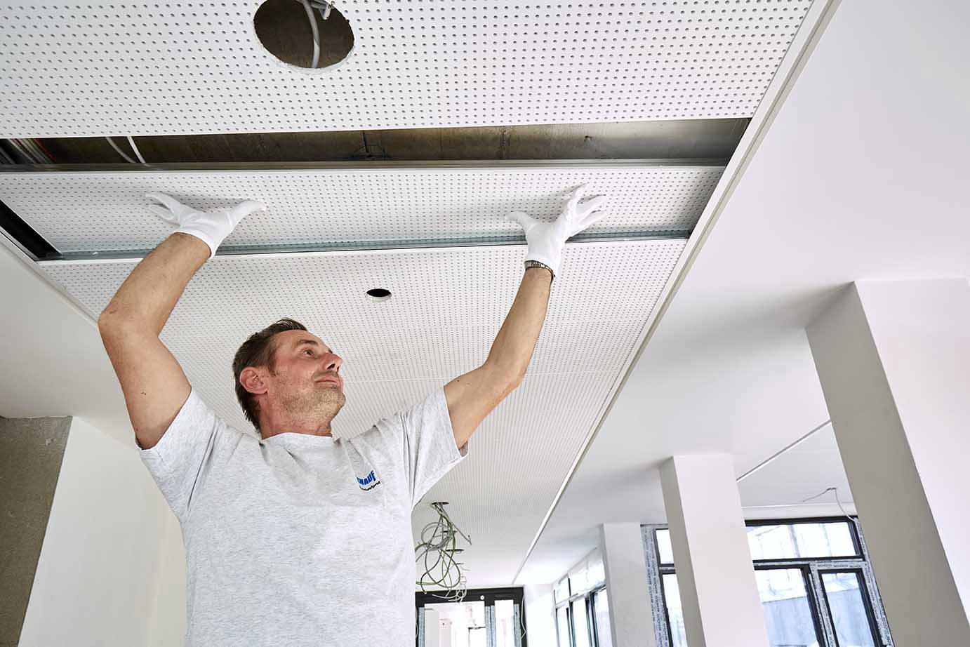 System type is important too. Knauf have two ceiling types which are demountable and non-demountable. A demountable system, a grid and tile system, allows access to services above the ceiling when needed. A non-demountable system is ideal where minimal access is needed and achieves more visual impact.