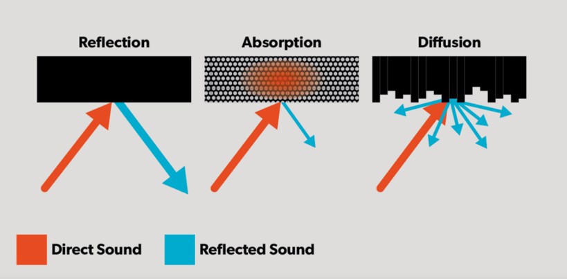 Sounds interacts with different surfaces in different ways. The sound waves reflected from hard surfaces are absorbed by soft or fabric surfaces and diffused by irregular surfaces.
