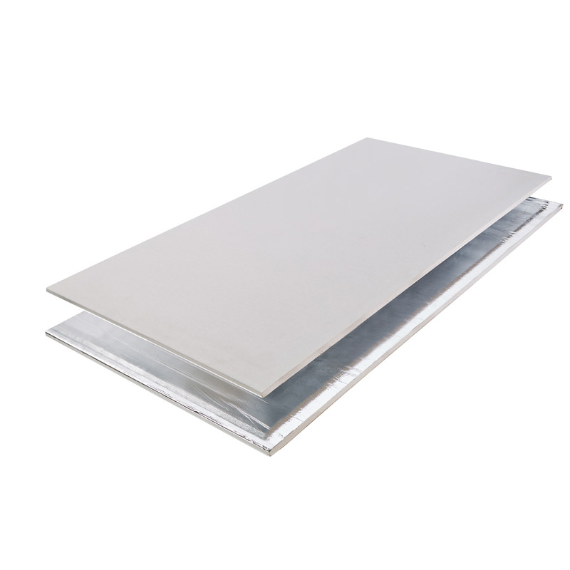 The plasterboard is made of a gypsum core between paper liners. The board's vapour control membrane is made from metallised polyester.