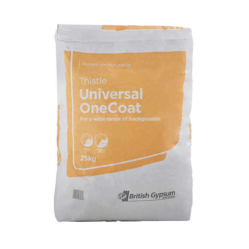 Thistle Universal OneCoat is a versatile gypsum undercoat and finish plaster in one product. It provides a smooth, inert and high quality surface to internal walls and ceilings, as well as a durable base for applying decorative finishes.