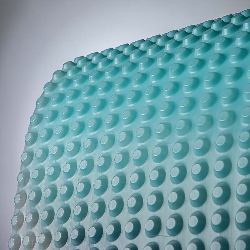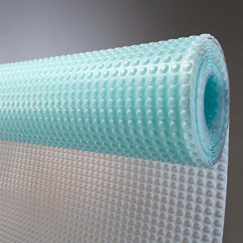 Visqueen CM8 Membrane is a 0.5mm thick high density polyethylene (HDPE) profiled sheet with approximate 7 mm high studs. The membrane is supplied in large format rolls of 2.07m x 20m with a 70mm flange edge on one side to aid jointing.